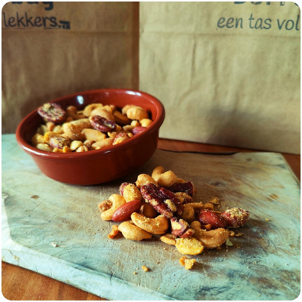 Heerlijke kruidige Javamix van cashewnoten, pinda's, pecannoten, cashew pedis en Djakarta kruiden. Vers gebrand.